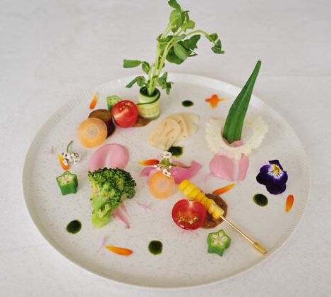 店内は、ガラス張り沿いにオシャレな木々が吊るされており、緑にあふれた癒しの空間です。看板メニューは季節の野菜を使用したヴィーガン対応のコース料理になります。